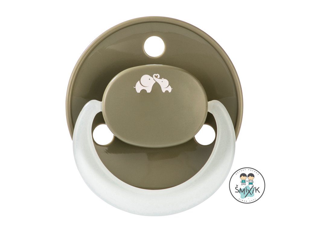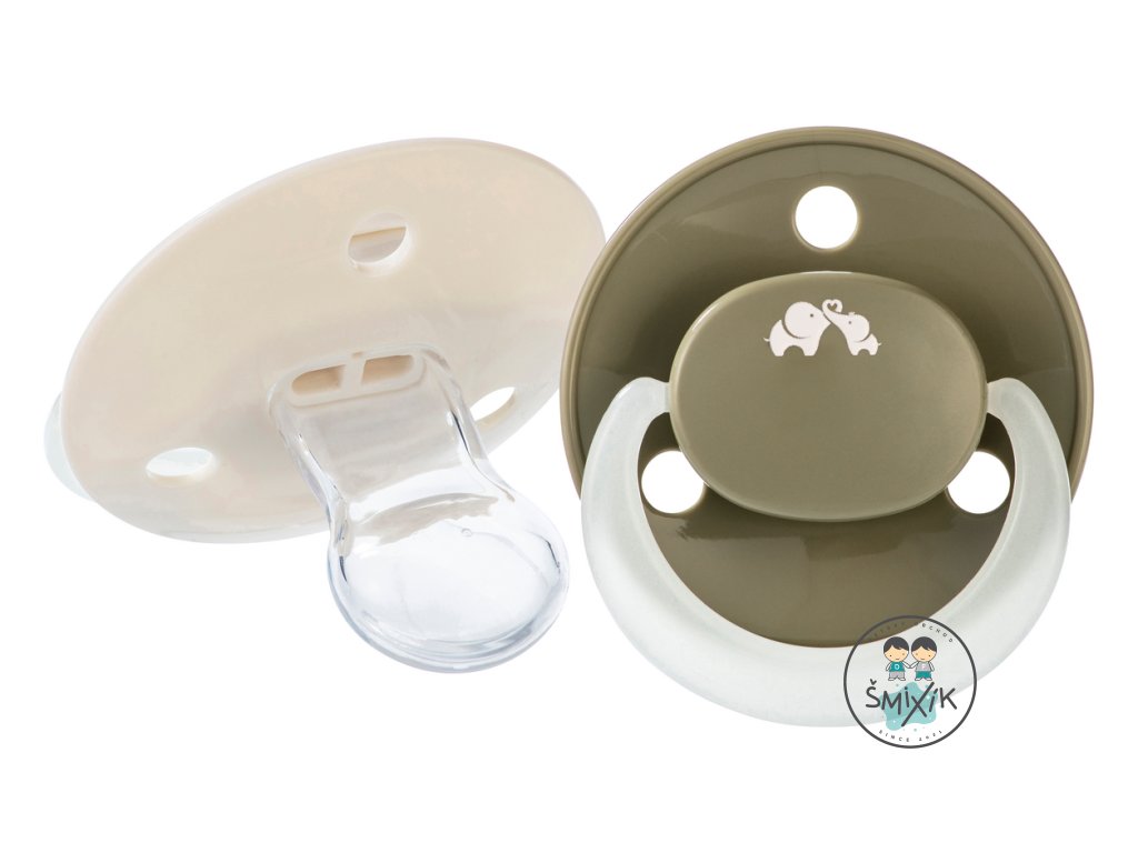 Cumlík so symetrickým cumlíkom z mäkkého silikónu. Vonkajšia časť cumlíka má otvory na cirkuláciu vzduchu, aby nedošlo k podráždeniu citlivej pokožky okolo úst. Krúžok cumlíka v tme svetielkuje, takže ho ľahko nájdete aj v noci v postieľke.