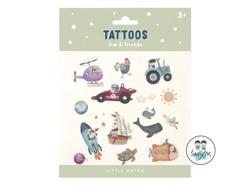 Dočasné detské tetovanie s krásnymi motívmi Jima a rôznych dopravných prostriedkov a zvierat. Samolepiace tetovanie sa ľahko aplikuje s pomocou vlhkej hubky.