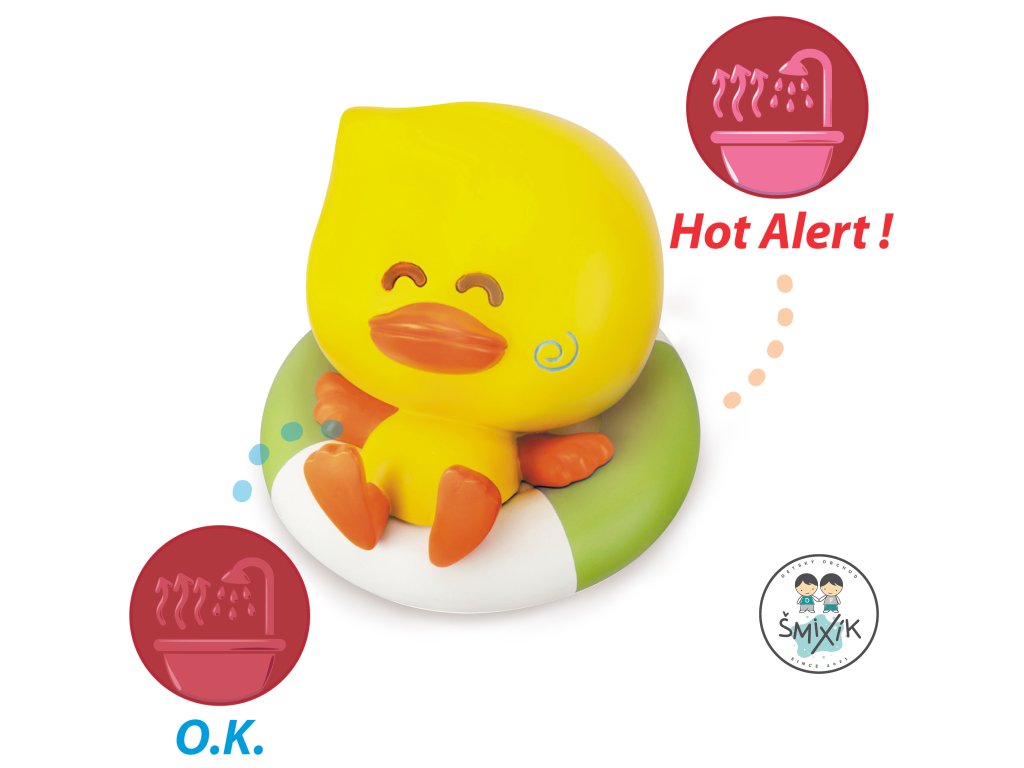Rozkošná hračka do kúpeľa v podobe kačičky je vybavená tepelným senzorom pre ľahkú a rýchlu kontrolu teploty vody vo vani. Po vložení do príliš teplej vody sa objaví kontrastný symbol na spodnej časti hračky, ktorý vás upozorní, že teplota vody nie je optimálna pre vloženie dieťaťa.