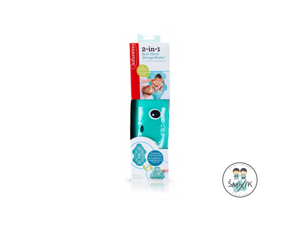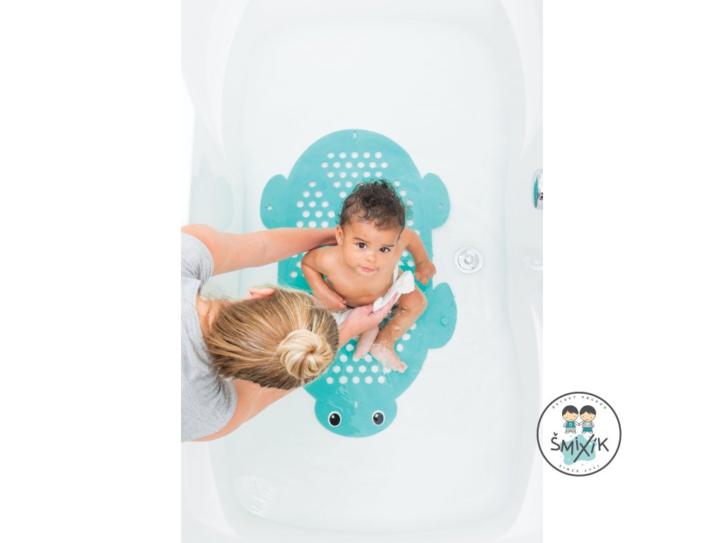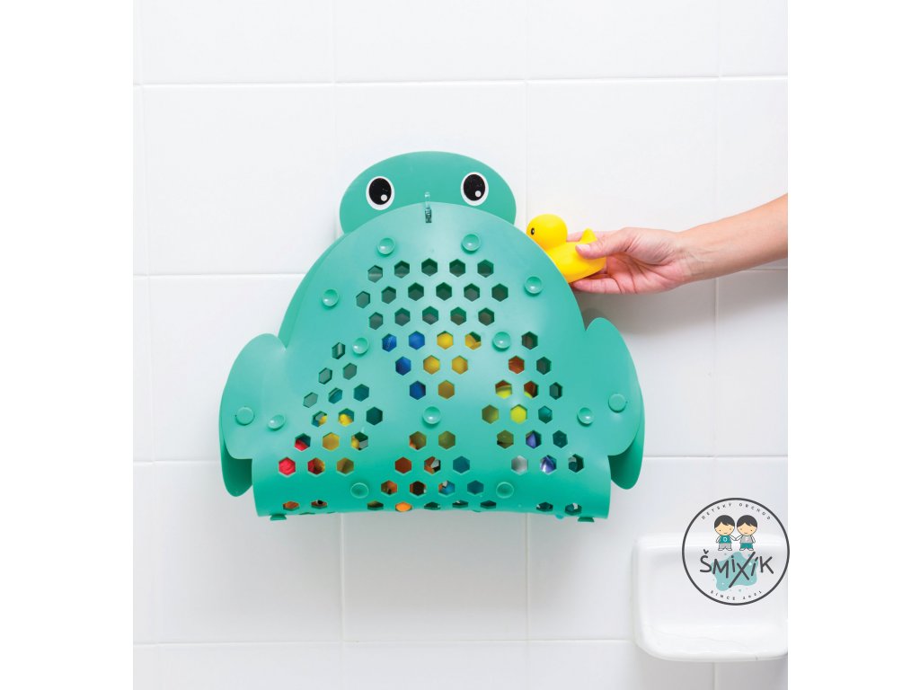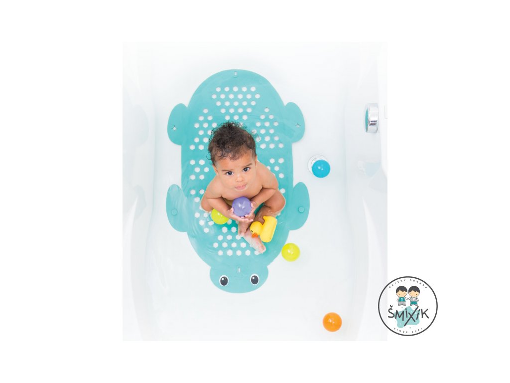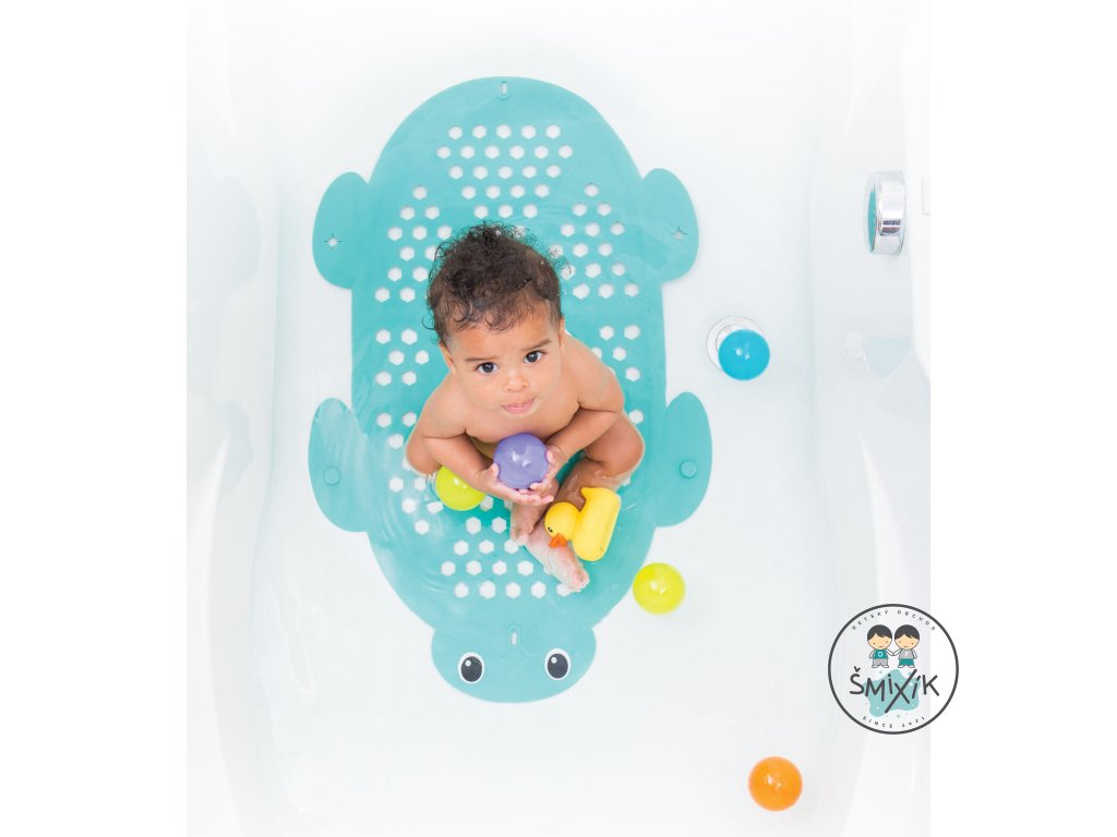 Protišmyková podložka do vane z príjemného, mäkkého materiálu slúži aj ako praktický košík na odkvapkávanie hračiek po kúpeli. Prísavky na spodnej strane udržujú podložku na mieste počas kúpania. Veľká prísavka s háčikom umožňuje zavesenie výrobku nad vaňu pri použití ako košíka na hračky.