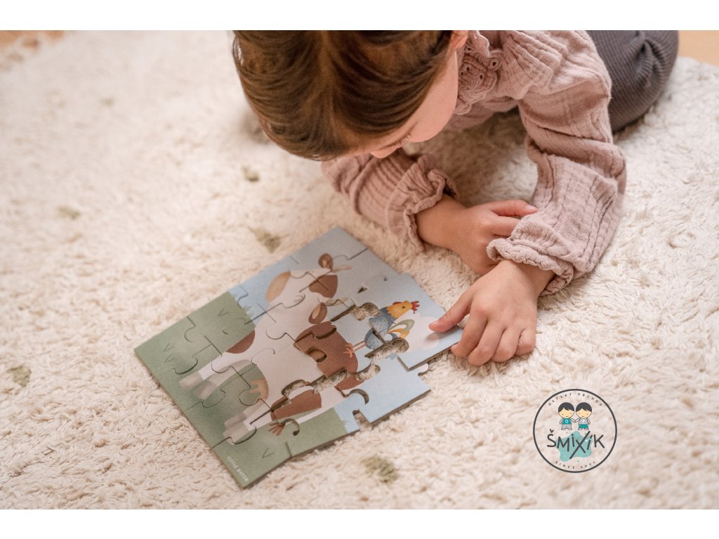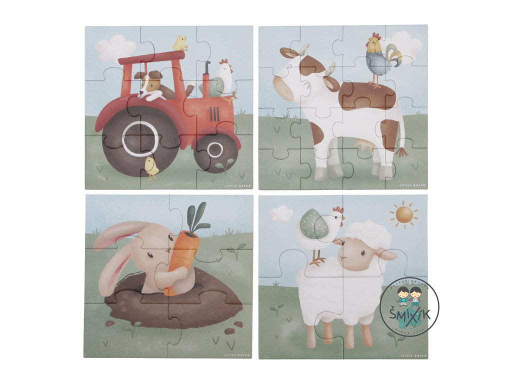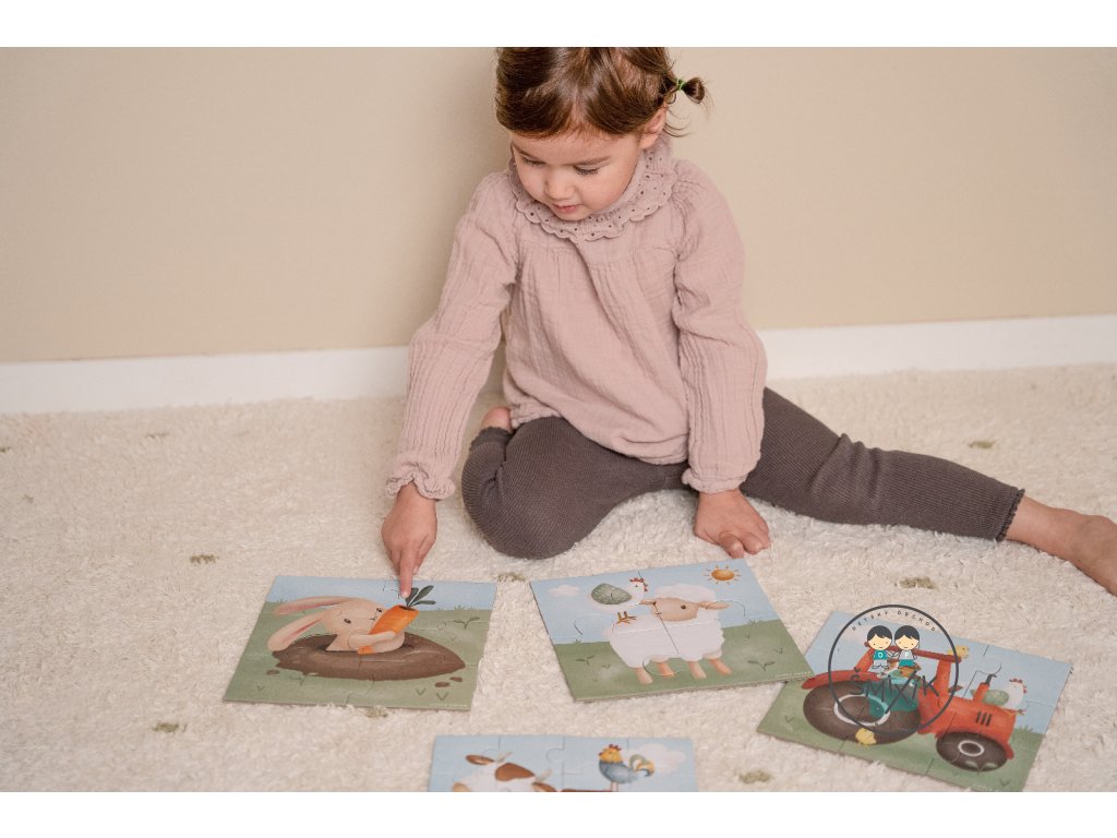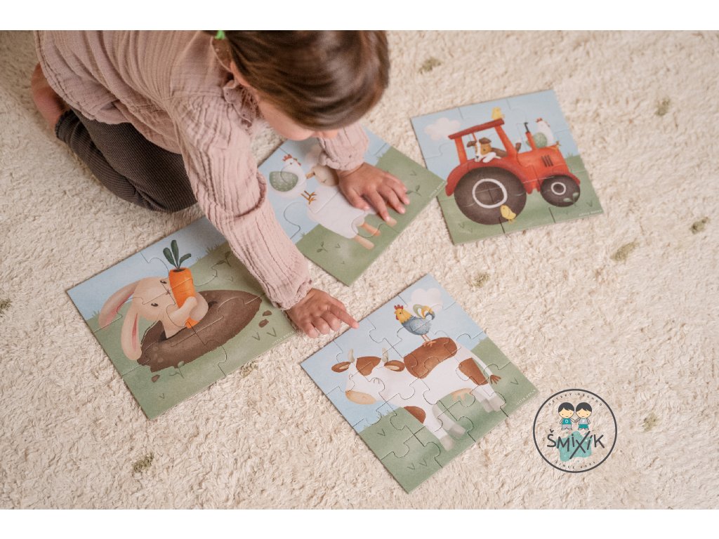 Zoznámte sa so životom na farme a skúmajte spolu s vašim dieťaťom tvary, farby aj zvieratká. Sada obsahuje 4 varianty puzzle skladačiek pre najmenších s krásnymi ilustráciami. Jednotlivé skladačky majú od 4 do 16 dielikov z pevného kartónu, ktoré sú dokonale tvarované pre malé detské ručičky.