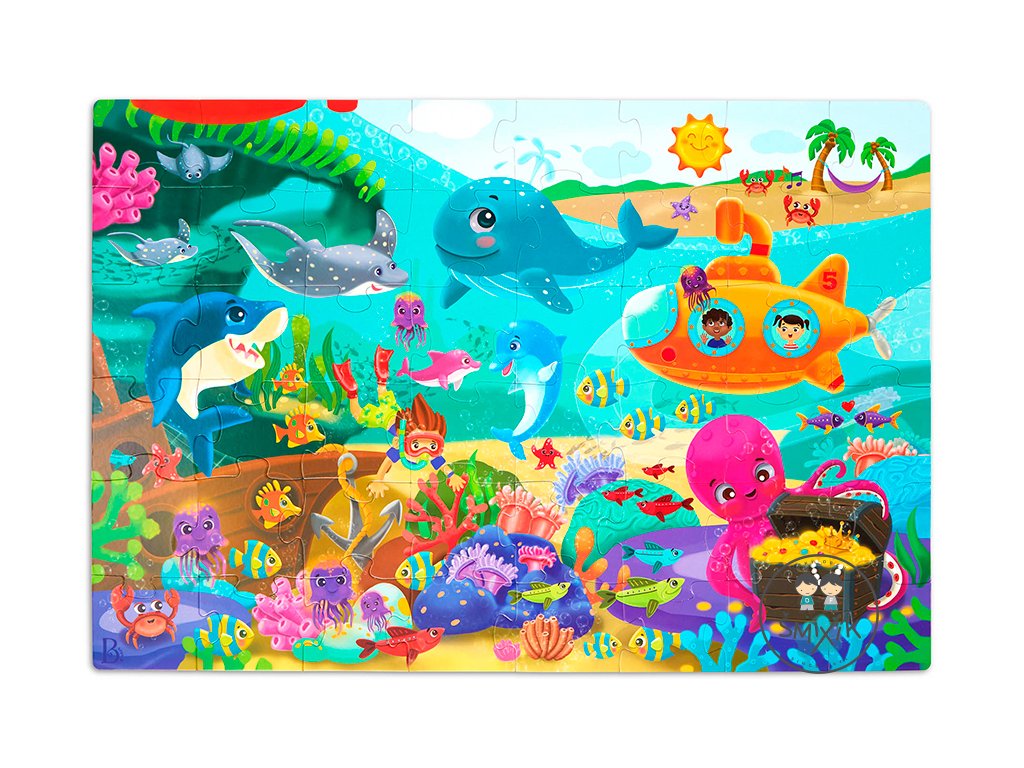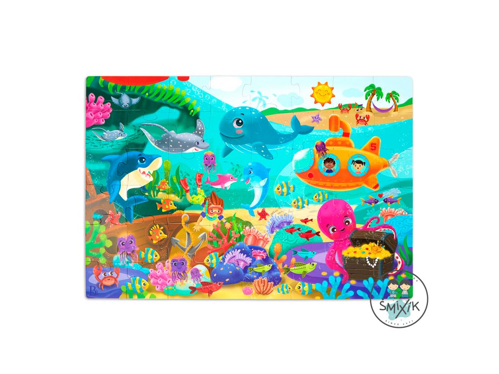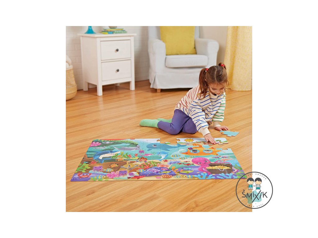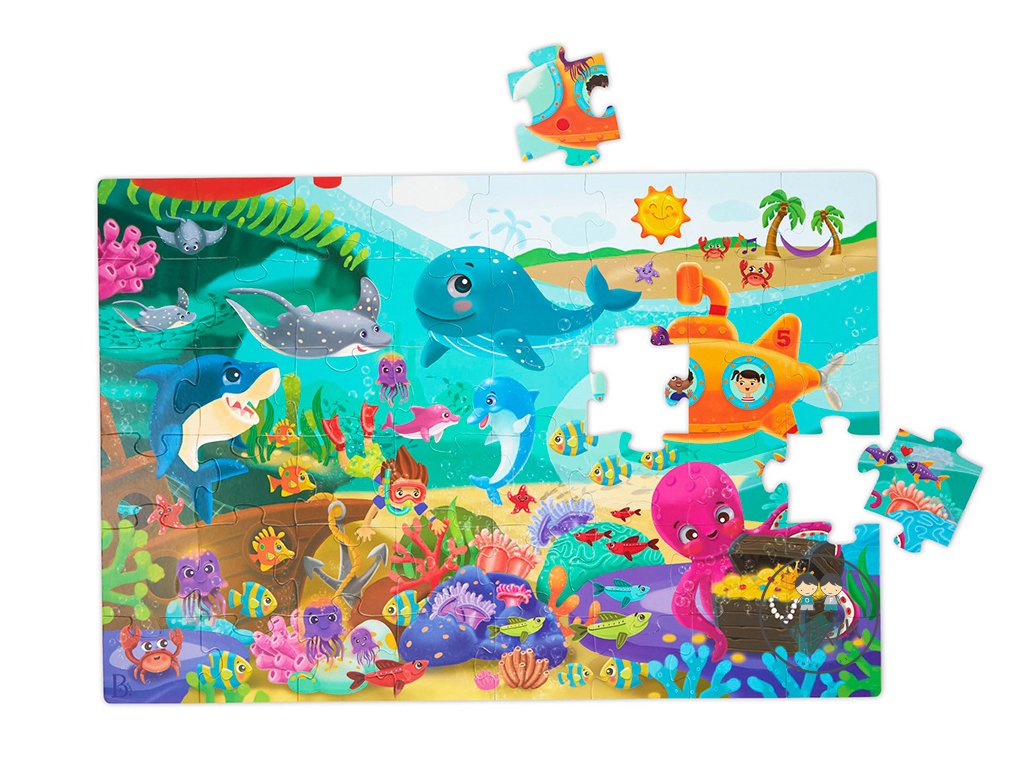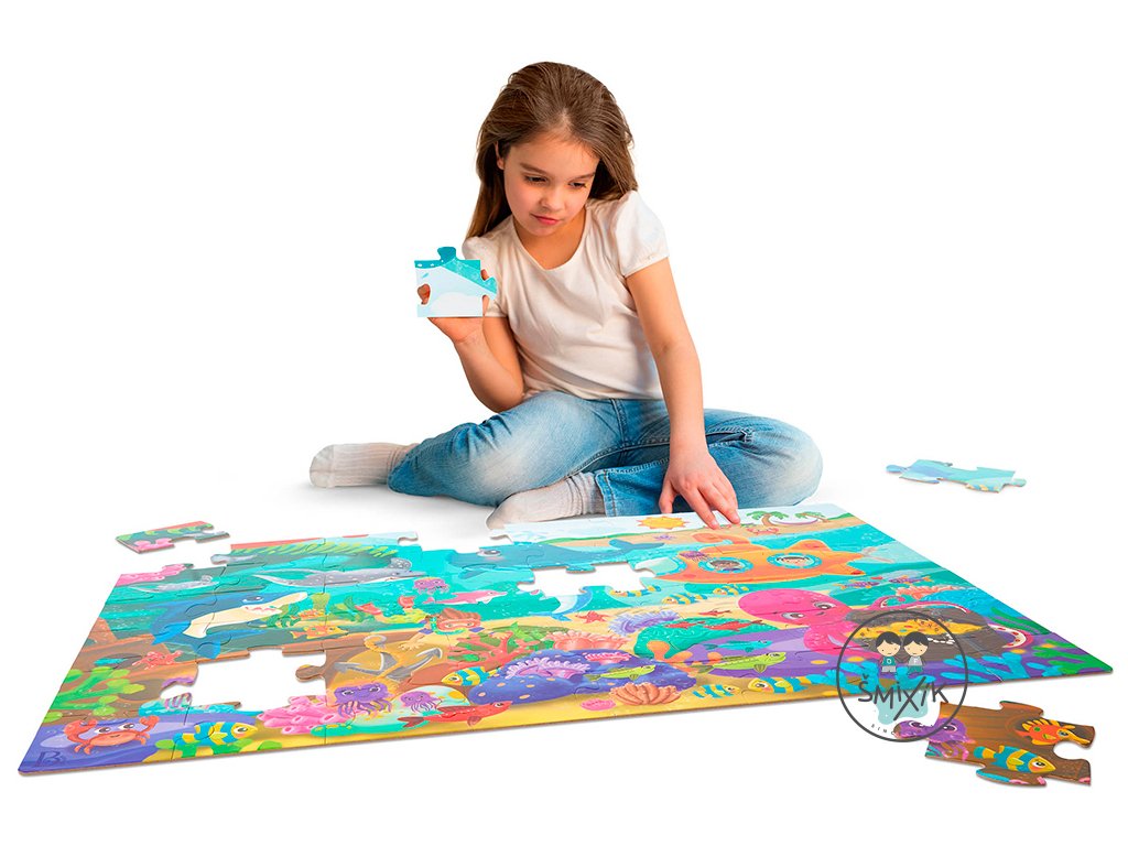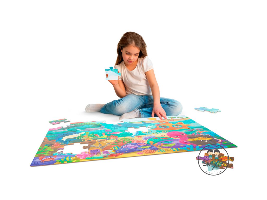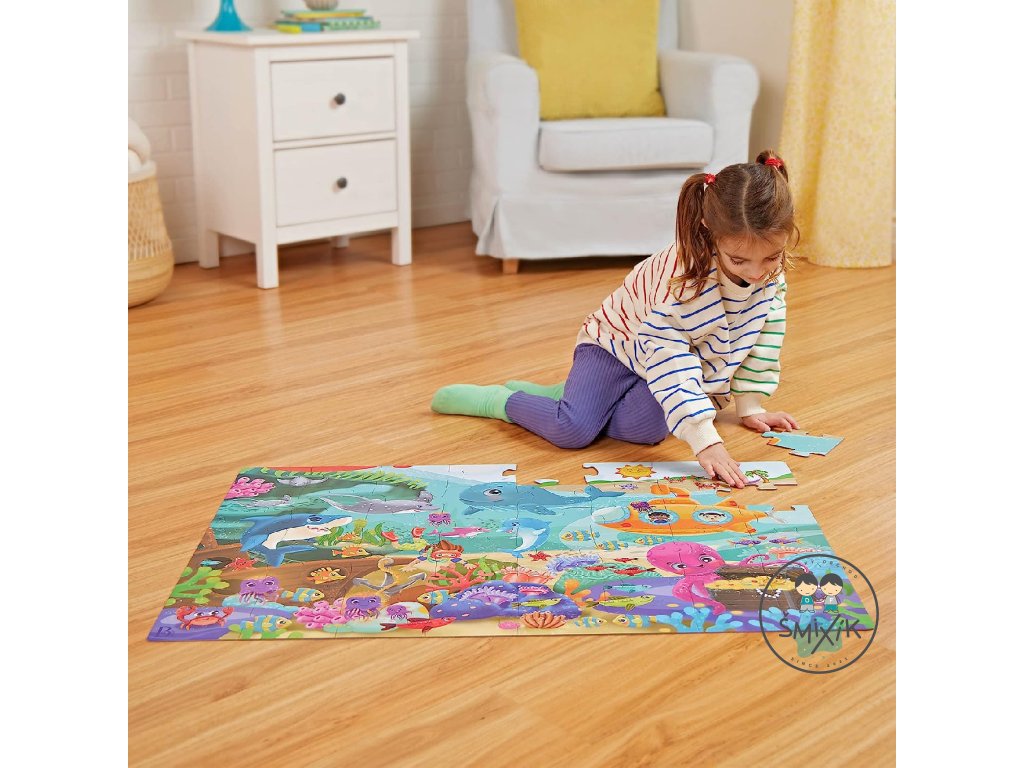 Pripravte sa na cestu do sveta pod morskou hladinou s maxi puzzle s krásnymi ilustráciami morského dna a jeho usmievavých obyvateľov! Extra veľké diely z pevného kartónu tvoria plochu 91,4 x 60,9 cm a sú tak ideálne na skladanie na podlahe.