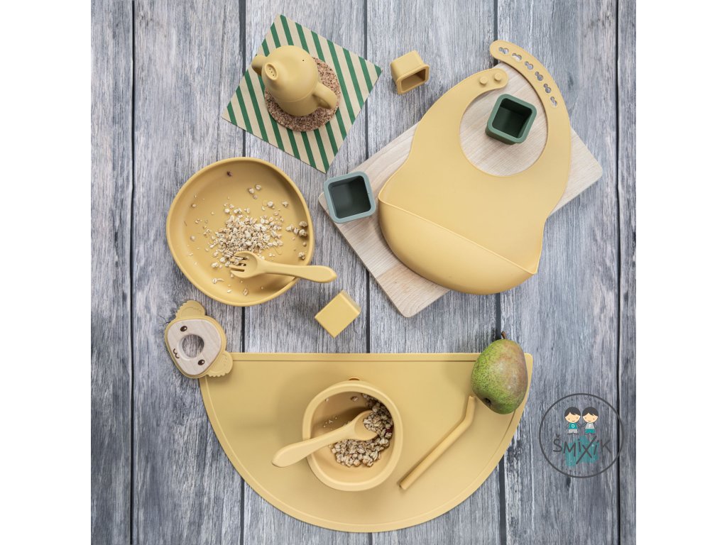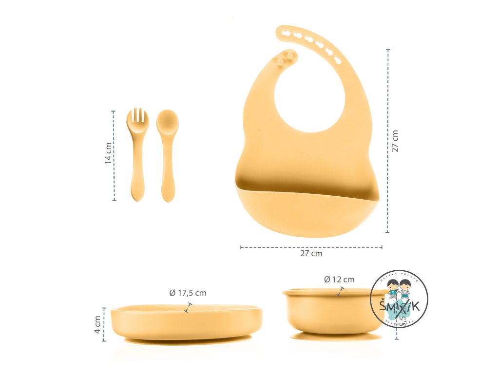 Sada nádob z potravinárskeho silikónu obsahuje misku so zvýšenými okrajmi a prísavkou, delený tanierik s prísavkou, nastaviteľný podbradník a lyžičku.