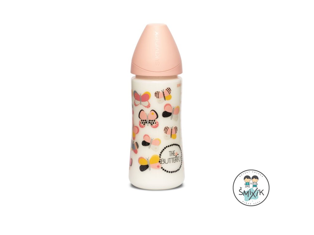 Širokohrdlá fľaša umožňuje rodičom jednoduchšie umývanie a prípravu pokrmu a vďaka svojmu širokému dnu je lepšie stabilná. Jej ergonomický tvar podporuje lepšie uchopenie počas kŕmenia bábätka. Má guľatý silikónový náhradný cumlík s veľkosťou prietoku L – náhradný cumlík uľahčuje sania hustejších pokrmov, napríklad kašou alebo mlieka s cereáliami.