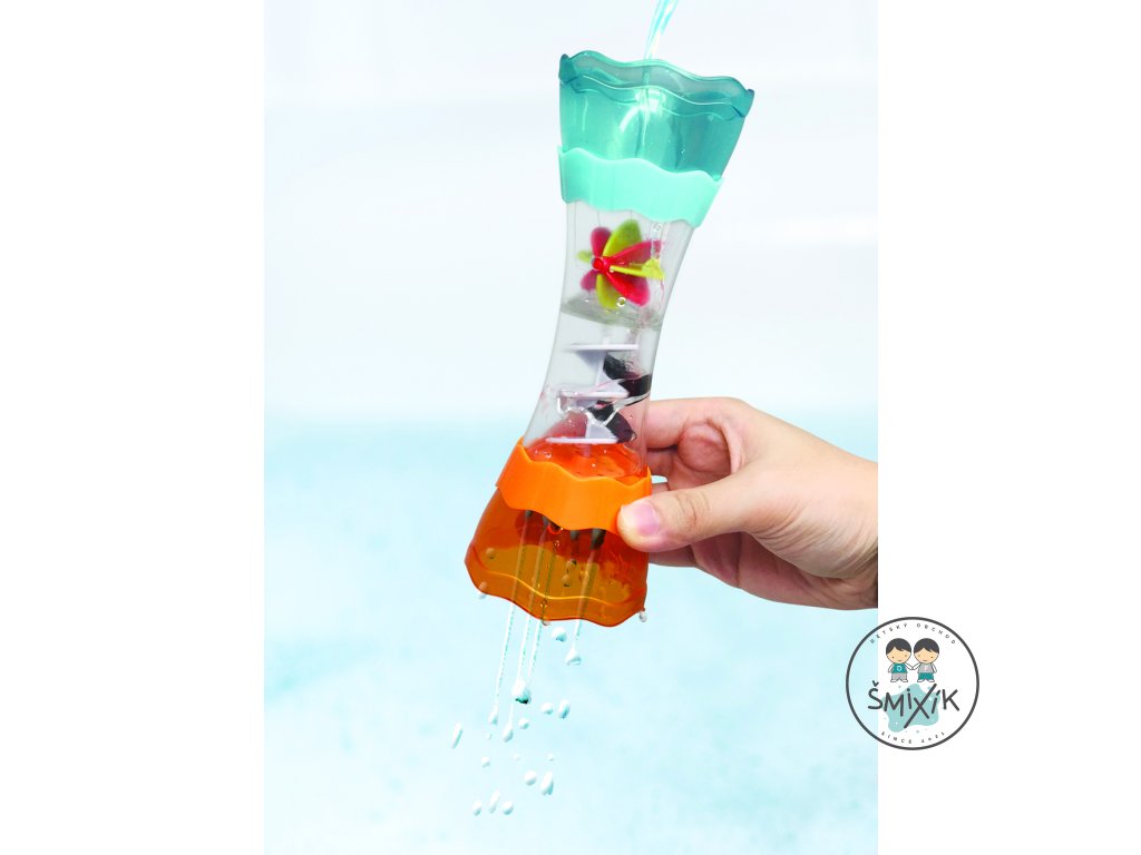 Priehľadná hračka do kúpeľa umožňuje dieťaťu naberať vodu a sledovať jej prietok hračkou, ktorým sa roztáča mlynček vnútri. Tvar hračky umožňuje ľahké uchopenie malými detskými ručičkami.